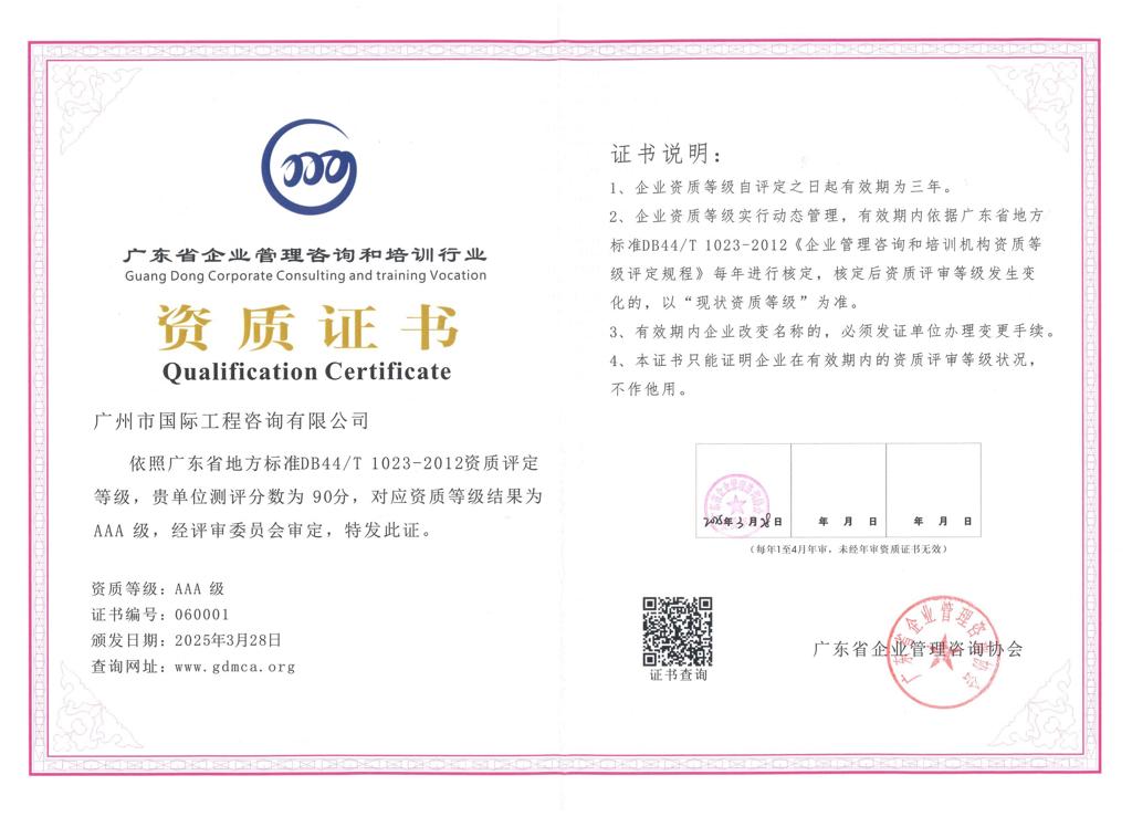 廣東省企業(yè)管理咨詢和培訓(xùn)行業(yè)AAA級資質(zhì)