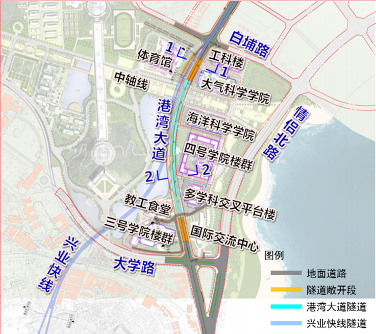 工程南起港灣大道~大學(xué)路交叉口,向北以地面道路形式敷設(shè),然后進(jìn)入隧道段,依次下穿中山大學(xué)規(guī)劃橫二路和中軸線后,在港灣大道~白埔路交叉口以南接地,終點(diǎn)與興業(yè)快線(北段)地面道路接順,全長約1.04km,其中地道敞開段約0.26km,地道暗埋段約0.67km,路基段約0.11km,車道規(guī)模為雙向6車道。主要建設(shè)內(nèi)容包括隧道工程、道路工程、管線工程、交通工程、安監(jiān)工程、景觀綠化工程及路燈照明工程等。