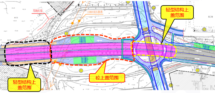 工程概況:廣深高速改造長度2.45km,道路由現(xiàn)狀雙向6車道擴建為雙向10車道,包含拆除橋梁783.8m/1座、小橋10.36m/1座;新建橋梁828.6m/2座,拼寬28.3m/2座;新建匝道長2.762km,包含拆除大橋963.2m/4座,新建橋梁511.2m/2座,收費站4處。地方路改造2.948km(其中開創(chuàng)大道主線長1.45km,單側(cè)輔道長1.498km),主路(雙向6車道)下沉式隧道870m/1座;輔道為雙向6車道,兩側(cè)設(shè)置慢行系統(tǒng)。立交改造隔音降噪上蓋范圍暫定為開創(chuàng)大道以北,主線兩端過渡段為主線橋梁起終點,上蓋面積約69741.4㎡,其中鋼筋砼結(jié)構(gòu)面積約48753㎡,鋼結(jié)構(gòu)面積約20988.42㎡。
