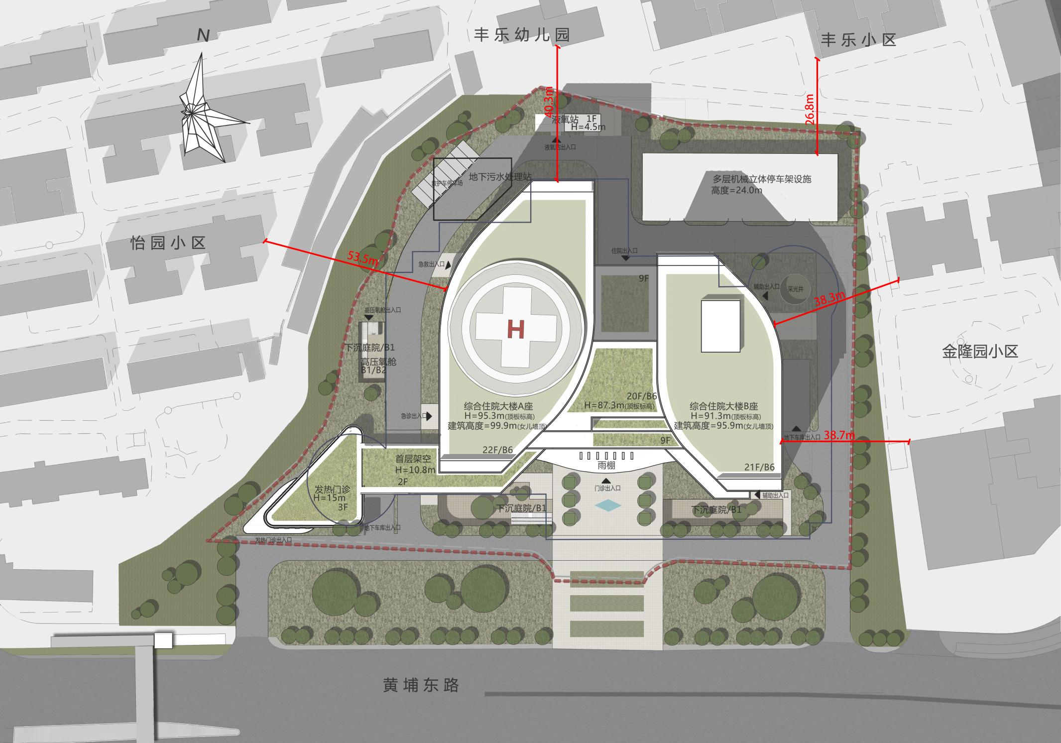 新建綜合住院大樓為單體99.9m高層建筑。地上22層,地下6層。