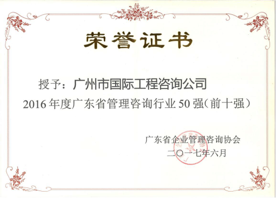 2017年6月24、25日,由廣東省企業(yè)管理咨詢(xún)協(xié)會(huì)組織的“第十屆國(guó)際管理咨詢(xún)師活動(dòng)日暨首屆中國(guó)制造100年高峰論壇活動(dòng)”于深圳隆重舉行。大會(huì)表彰了一批廣東省管理咨詢(xún)行業(yè)先進(jìn)單位,其中,廣州市國(guó)際工程咨詢(xún)公司榮獲“2016年度廣東省管理咨詢(xún)行業(yè)50強(qiáng)(前十強(qiáng))”和“2017年廣東省中小企業(yè)優(yōu)秀服務(wù)機(jī)構(gòu)100佳”稱(chēng)號(hào)。張維副總經(jīng)理作為公司代表參與了此次表彰活動(dòng)。