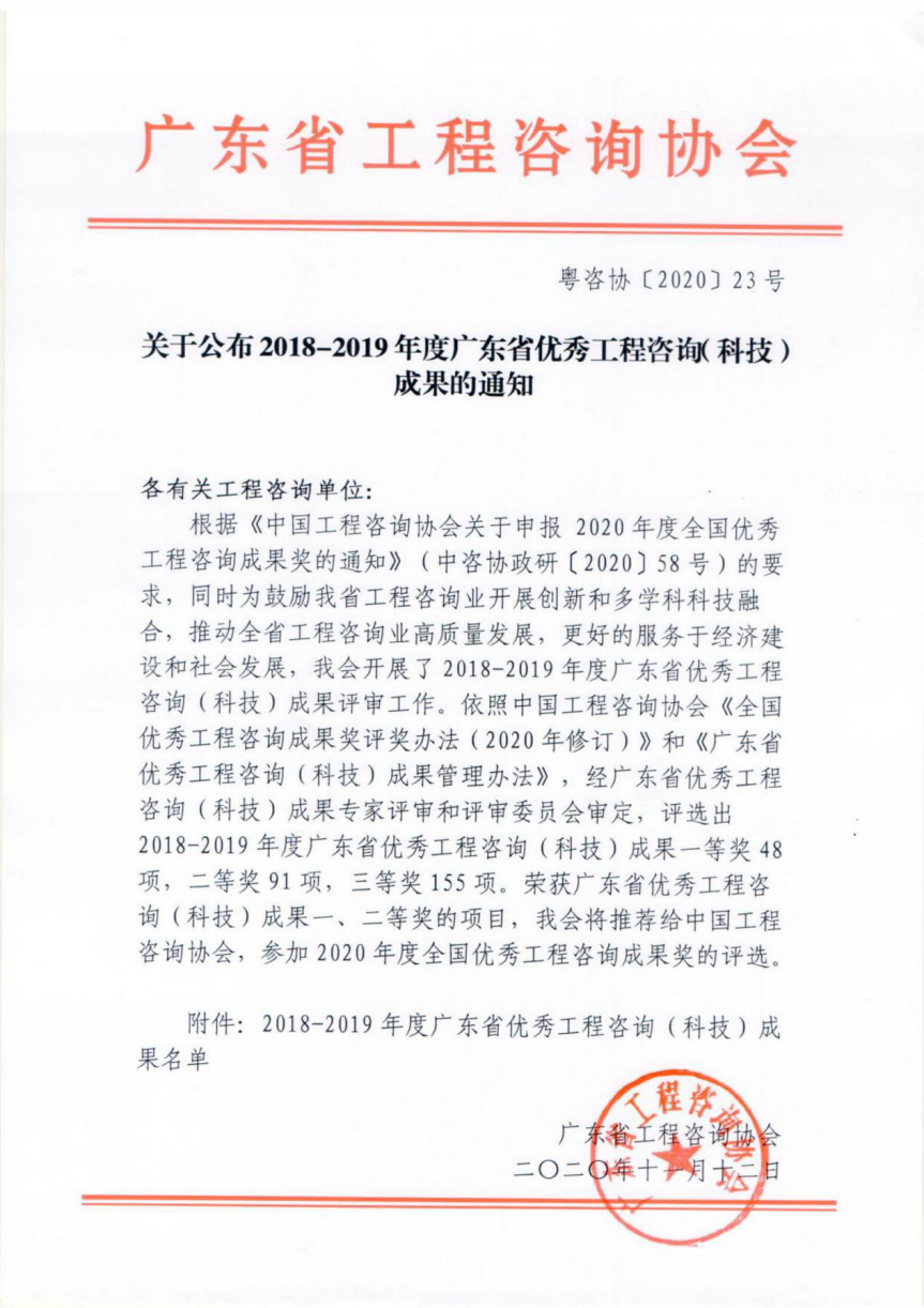 我司多個項目榮獲2018-2019年度廣東省優(yōu)秀工程咨詢(科技)成果獎