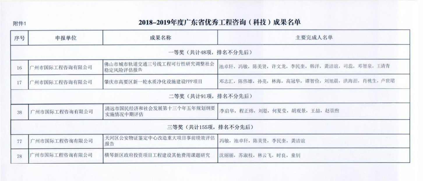 近日,廣東省工程咨詢協(xié)會公布了2018-2019年度廣東省優(yōu)秀工程咨詢(科技)成果獎,經(jīng)單位申報、廣東省優(yōu)秀工程咨詢(科技)成果專家評審和評審委員會審定,廣州市國際工程咨詢有限公司申報的5個項目獲得了2018-2019年度廣東省優(yōu)秀工程咨詢(科技)成果獎,分別是:《佛山市城市軌道交通三號線工程可行性研究調(diào)整社會穩(wěn)定風(fēng)險評估報告》《肇慶市高要區(qū)新一輪水質(zhì)凈化設(shè)施建設(shè)PPP項目》榮獲2018-2019年度廣東省優(yōu)秀工程咨詢(科技)成果獎一等獎;《清遠(yuǎn)市國民經(jīng)濟(jì)和社會發(fā)展第十三個年五年規(guī)劃綱要實施情況中期評估》榮獲2018-2019年度廣東省優(yōu)秀工程咨詢(科技)成果獎二等獎;《天河區(qū)公安物證鑒定中心改造重大項目事前績效評估報告》《橫琴新區(qū)政府投資項目工程建設(shè)其他費用課題研究》榮獲2018-2019年度廣東省優(yōu)秀工程咨詢(科技)成果獎三等獎。